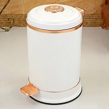 Небольшое, привлекательное ведро в белом цвете, с золотыми элементами. Оно выполнено из металла, с плотной крышкой и педалью для ее поднятия и опускания.